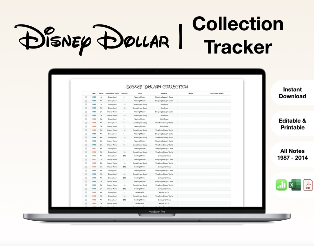 Disney Dollar Collection List - Excel + Apple Numbers + PDF Instant Digital Download & Printable